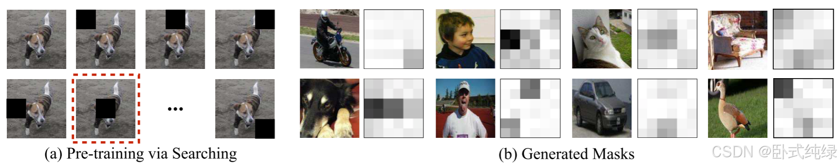 其中Aij(Xp)表示给定输入特征映射Xp, ASDN在位置(i, j)的输出。我们用这个损失训练ASDN进行10K次迭代。图(b)显示,网络开始识别物体的哪一部分对分类有意义。还要注意,我们的输出掩码与[31]中提出的注意力掩码不同,后者使用注意力机制来促进分类。在我们的例子中,我们使用遮罩遮挡部分,使分类更加困难。