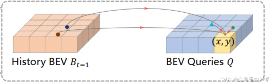 - 根据自车的运动来对齐 t − 1 t-1 t−1时刻的BEV特征与 Q Q Q查询,使得特征在与相同真实世界位置关联的BEV网格中