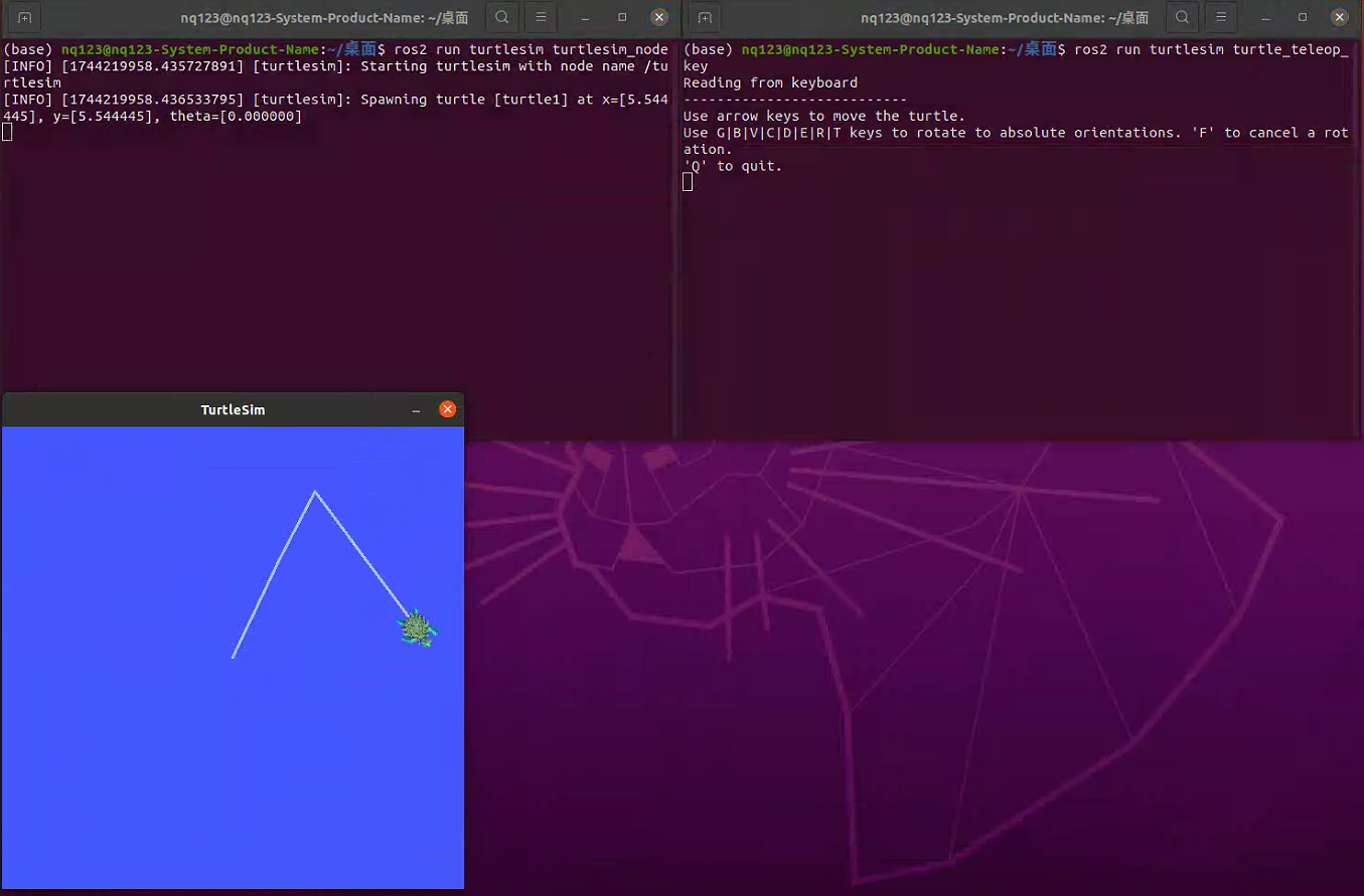 ROS中的经典示例——小海龟仿真器。ROS安装好后,关闭当前安装ROS的终端,重新启动两个新终端,分别运行指令来测试