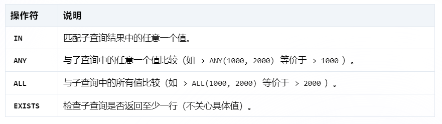 • 多行子查询:返回 多行一列 的结果, 不能使用单值比较符操作,可以使用 in,any,all,exists 来查询。
