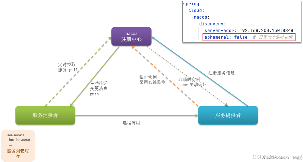 - Nacos支持服务端主动检测提供者状态:临时实例采用心跳模式,非临时实例采用主动检测模式