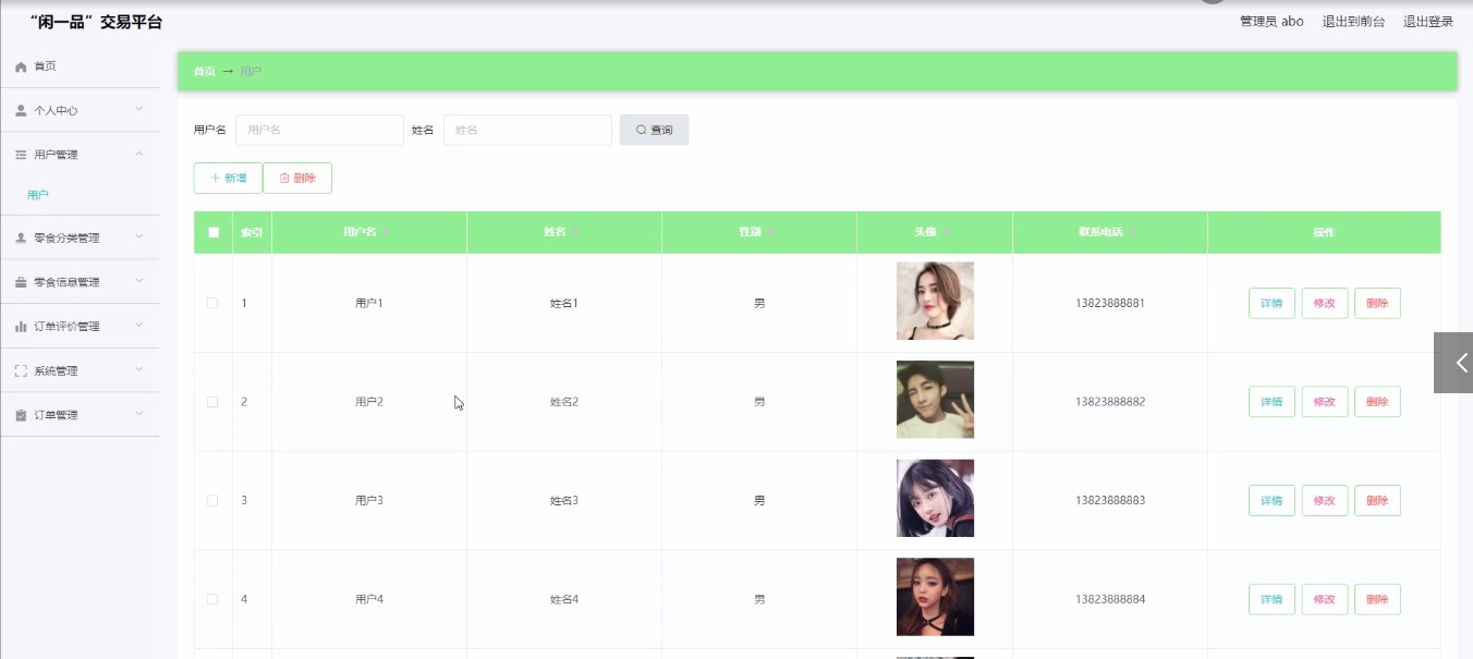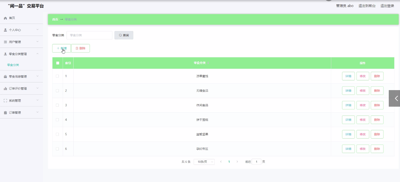 管理员功能:首页、个人中心、用户管理、零食分类管理、零食信息管理、订单评价管理、系统管理、订单管理。用户功能:首页、个人中心、订单评价管理、我的收藏管理、订单管理。前台首页功能:首页、零食信息、零食资讯、个人中心、后台管理、购物车、在线客服。
