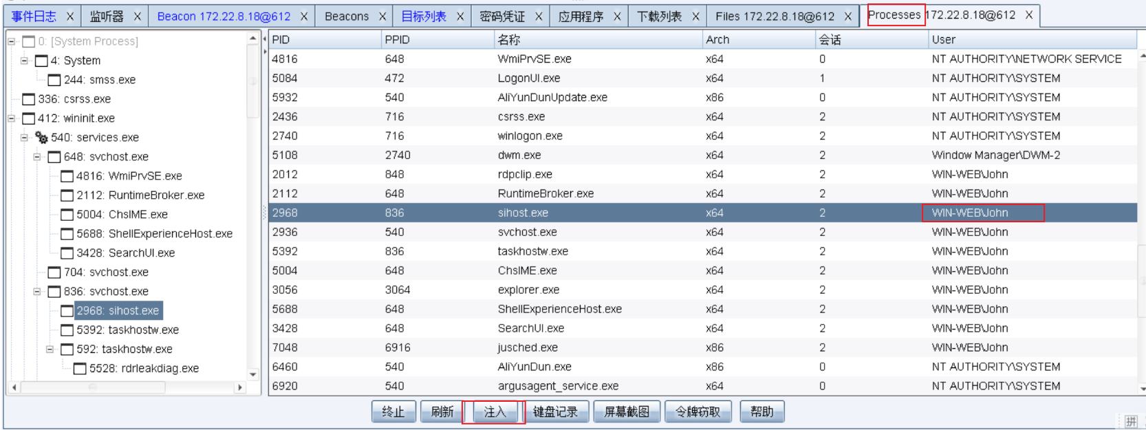 查看进程列表, 选择john用户的进程进行注入
