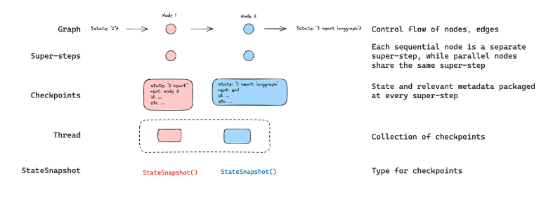 LangGraph 内置了一个持久化层,通过检查点(checkpointer)机制实现。当你使用检查点器编译图时,它会在每个超级步骤(super-step)自动保存图状态的检查点。这些检查点被存储在一个线程(thread)中,可在图执行后随时访问。由于线程允许在执行后访问图的状态,因此实现了人工介入(human-in-the-loop)、记忆(memory)、时间回溯(time travel)和容错(fault-tolerance)等强大功能。具体操作指南提供了端到端示例,说明如何为图添加并使用检查点器。下文我们将分别的详细讨论这些概念。