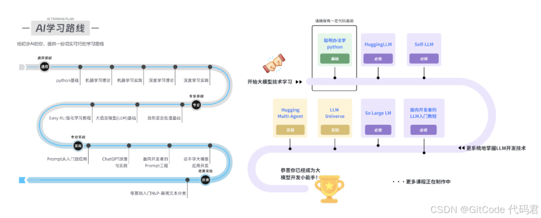 Datawhale 已开发出 120 余门高质量的 AI 开源课程,内容涵盖数据分析、计算机视觉、自然语言处理、推荐系统等 AI 主流方向。这些课程将通过 GitCode 平台免费开放,为全球学习者提供便捷的学习途径。