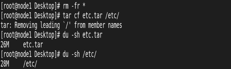 先清空桌面的文件,重新建立 etc.tar 归档文件,打包 etc 目录。然后查看 etc.tar 归档文件和 etc 目录占用内存大小。