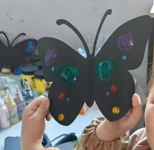 黑色卡纸,对称折叠,在一侧挤压颜料,然后对折按压,会出现对称的图案颜色