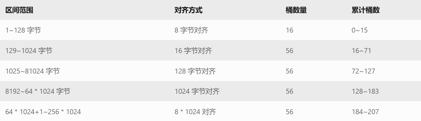 根据对象大小,将内存请求分为不同区间,并采用不同的对齐粒度