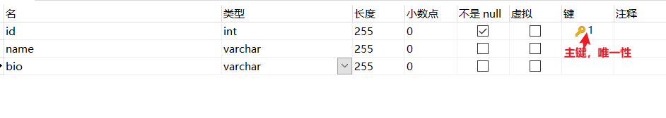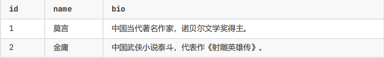 注:在这个表格中,id 是主键,name 是作者的名字,bio 是作者的简介。