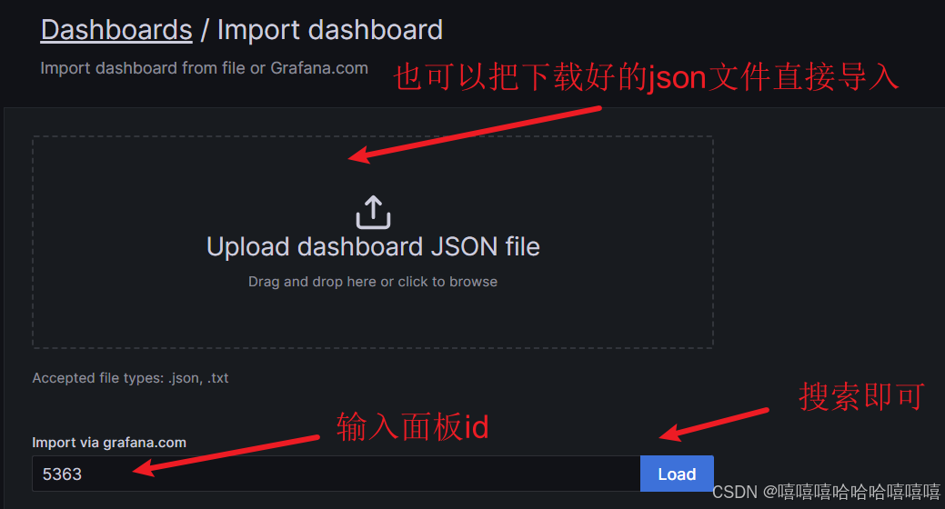在 grafana 页面中, Dashboards -> + Import ,输入面板 ID 号或者上传 JSON 文件,