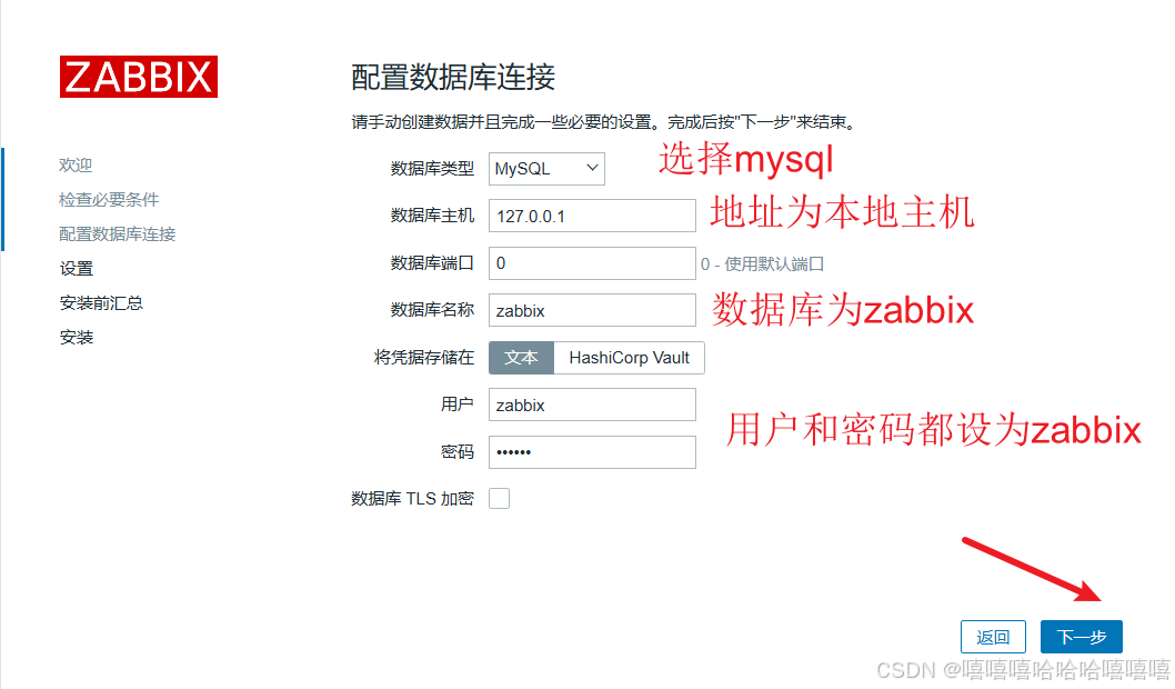 【数据库主机】输入 127.0.0.1 ;【密码】输入 zabbix,点击下一步