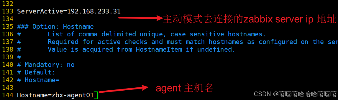 ServerActive=192.168.233.31 #133行,指定agent将主动连接的Zabbix Server IP地址。