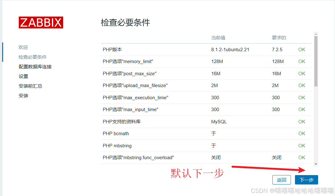 【Zabbix主机名称】输入 zbx-demo;【默认时区】选择 Asia/Shanghai,点击下一步