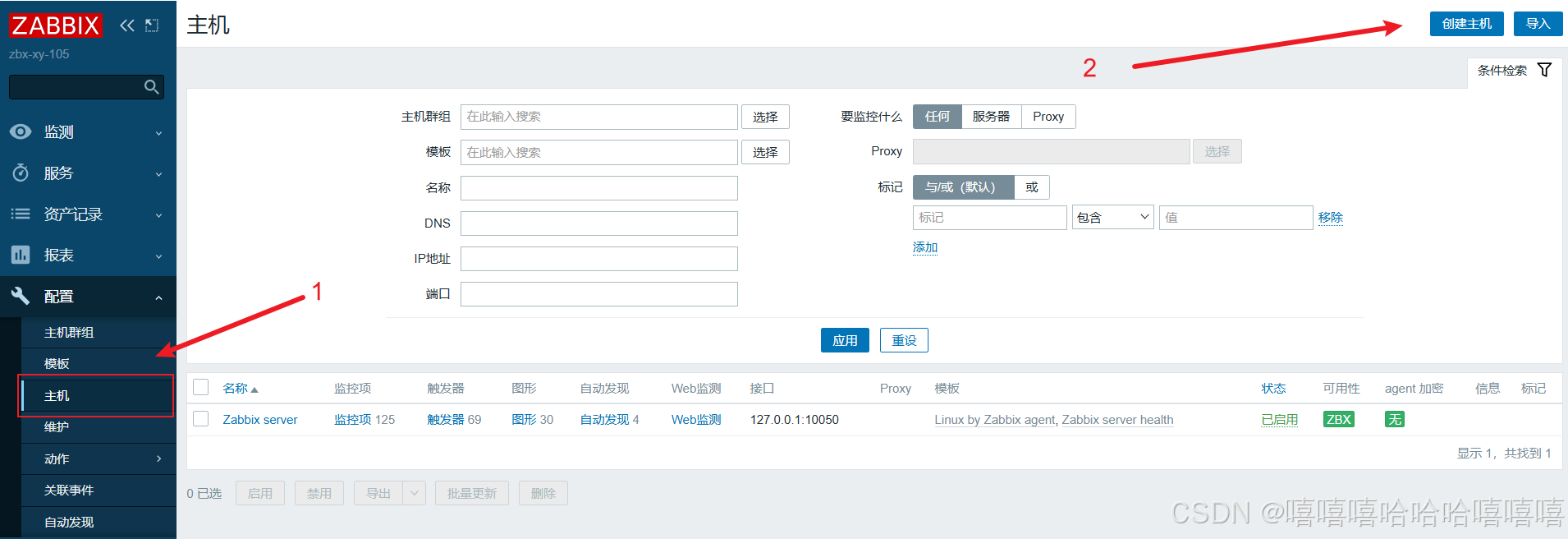 点击左边菜单栏【配置】中的【主机】,点击【创建主机】