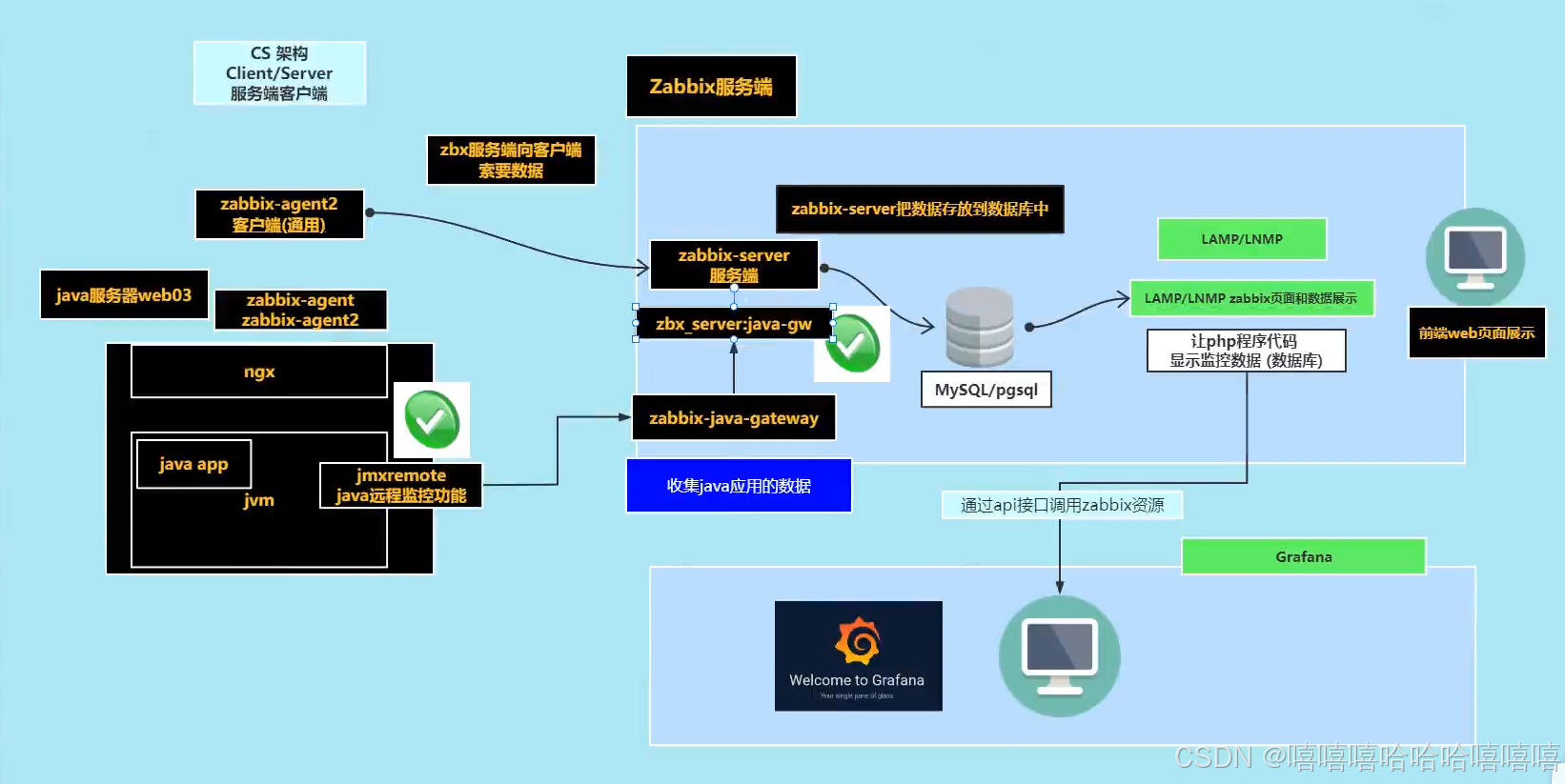 Zabbix 由 2 部分构成,zabbix server 与可选组件 zabbix agent。通过 C/S 模式采集数据,通过 B/S 模式在 Web 端展示和配置。