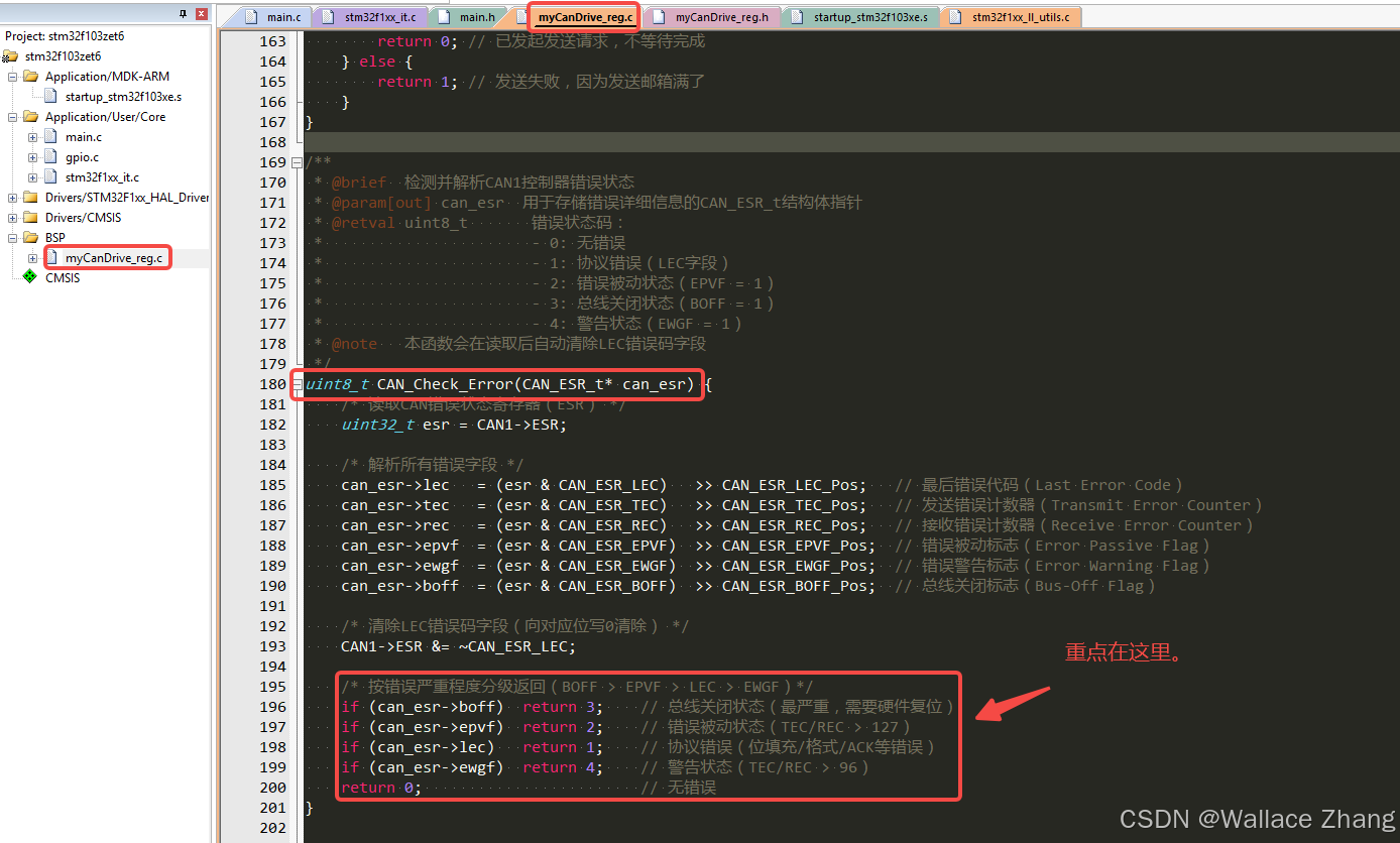 《STM32F103_HAL库+寄存器学习笔记15 - 梳理CAN发送失败时,涉及哪些寄存器》从上一章节看到,当CAN消息发送失败时,CAN错误状态寄存器ESR的TEC会持续累加,LEC等于0x03(ACK错误)。本次实验的目的是编写一个函数CAN_Check_Error(),在main()的主循环里每隔50ms执行一次,将寄存器CAN_ESR的各个段赋值给全局变量gCanESR,方便应用程序获取寄存器CAN_ESR的各个段的内容。