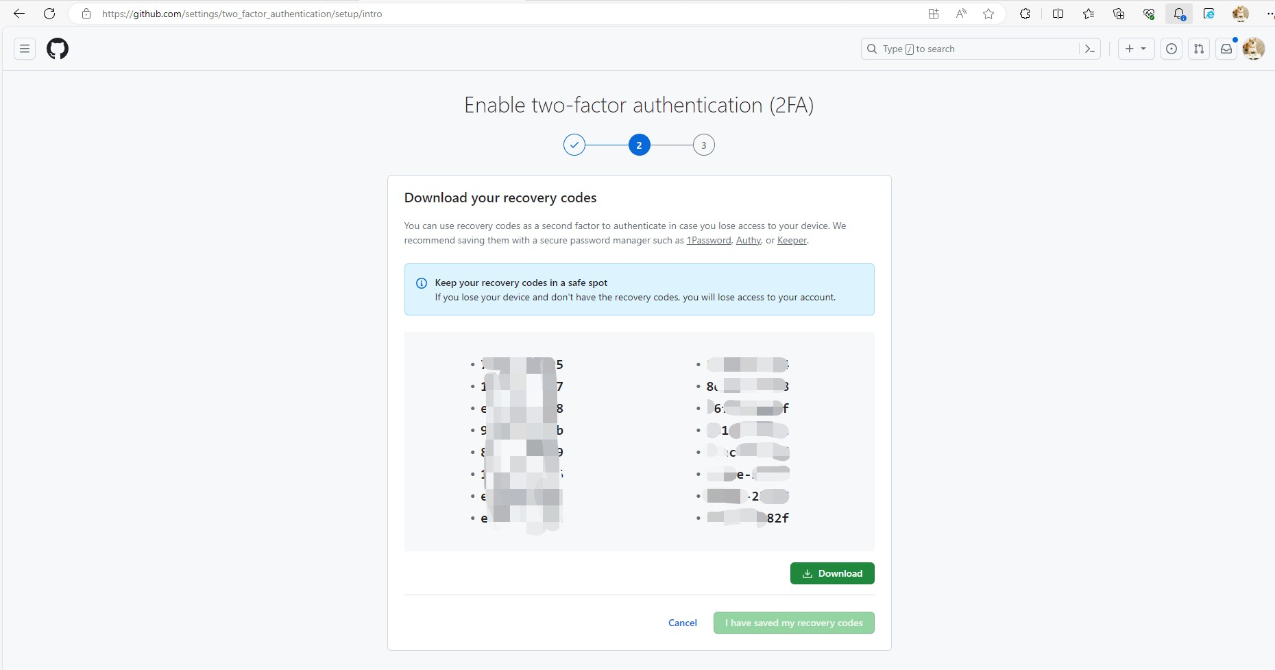 该页面将提供【Recovery Code(恢复码)】,有很多个。github将要求你必须下载下来保存好,便于哪天万一手机设备不可用或丢失时,可通过【恢复码】充当备用(相对于手机认证器)第2认证因子。