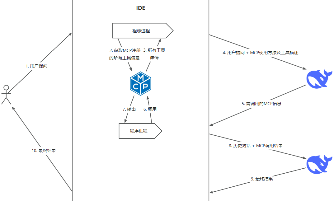 单步执行: 通常在一次交互中完成“请求→MCP工具调用→返回结果”。 -