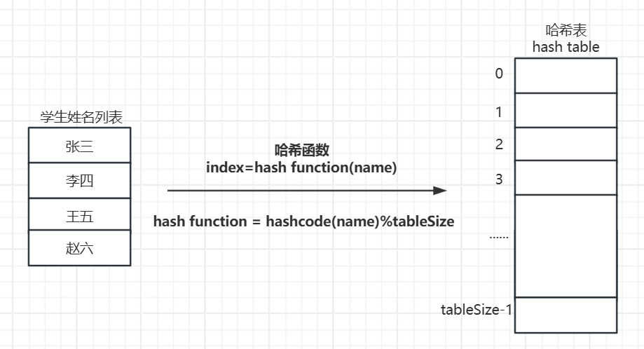 hashcode可以把名字转化为数值;数值可能大于tableSize;所以数值与tableSize取模,保证值落在数组范围内[0, tableSize-1]。