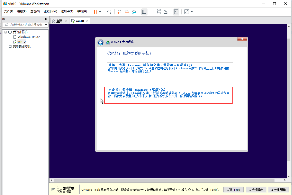 2、选择自定义,并点击下一步