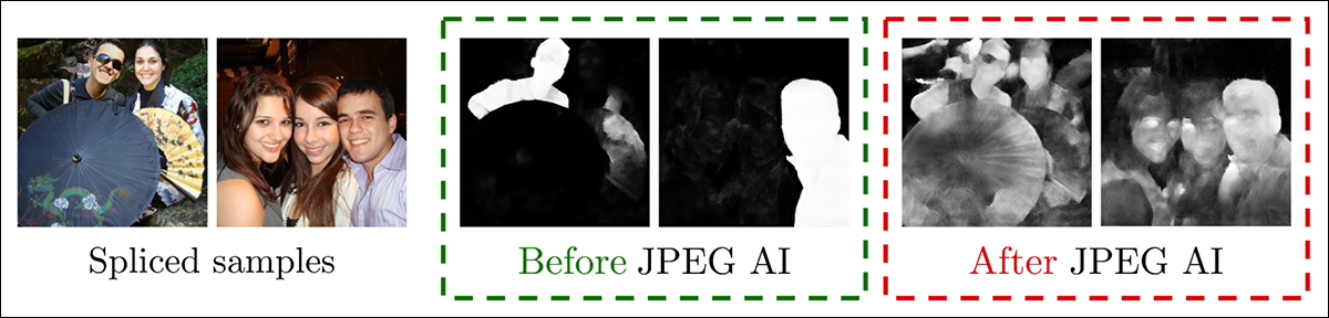 根据最近一篇论文(2025年3月),经过JPEG AI压缩后,最先进的算法在定位图中已无法可靠地区分真实内容和被篡改区域。左侧的原始示例是被篡改/伪造的图像,在标准鉴伪技术下,篡改区域在中间图像中清晰可辨。然而,JPEG AI压缩使伪造图像更具可信度(最右侧图像)。