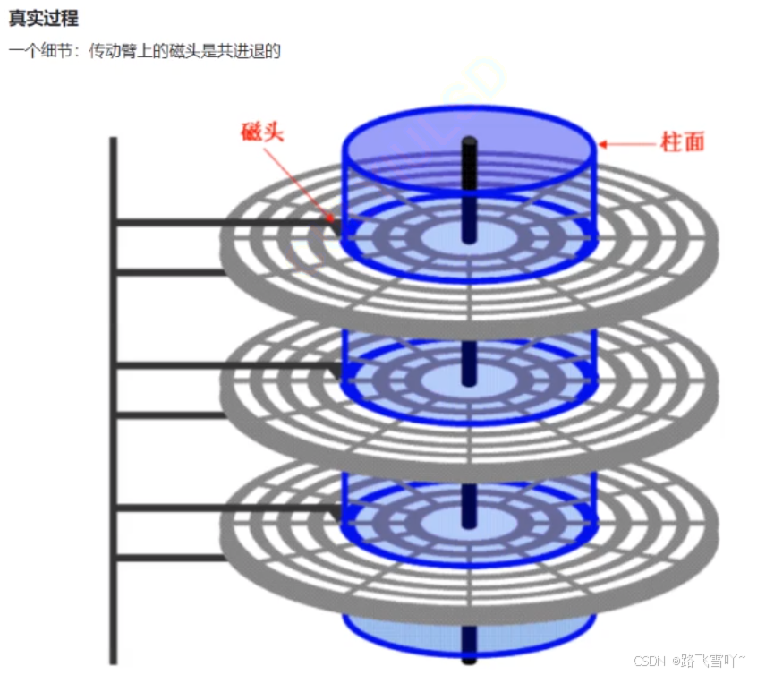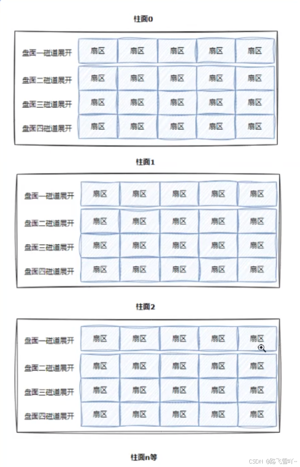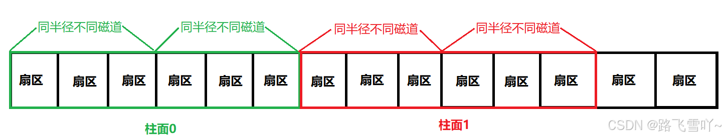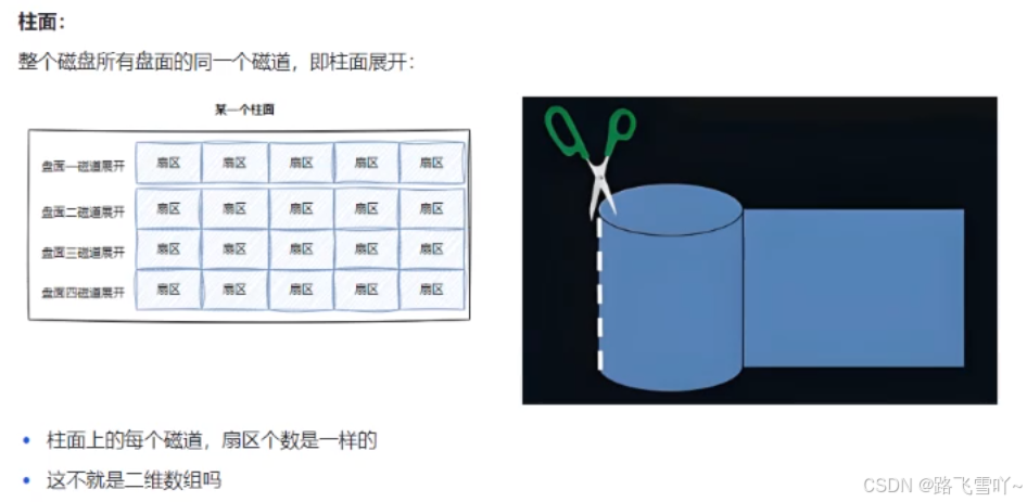 柱面是一个逻辑上的概念,其实就是每一个面上,相同半径的磁道逻辑上构成柱面。所以,磁盘物理上分了很多面,但是在我们看来,逻辑上,磁盘整体是由“柱面”卷起来的。