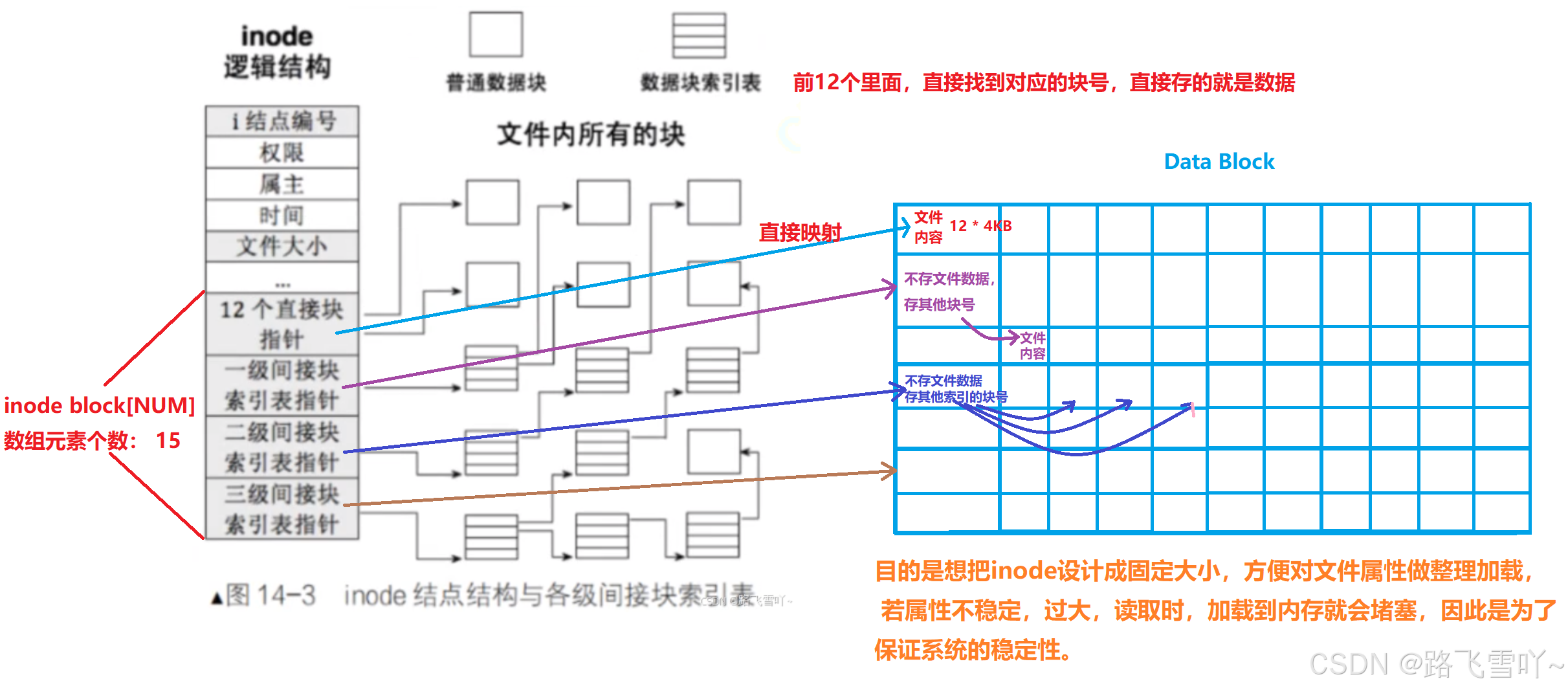 🌠在Linux中,找文件要用inode去找呢?文件名不在inode保存,是保存在当前所处的目录,所对应的数据块当中的!!!如果没有inode我们的文件名就存在属性里,这时查找文件时,都是按照文件名【字符串】来查找文件的,字符串可长可短,影响查找的效率,而inode是一个整数,效率更高。