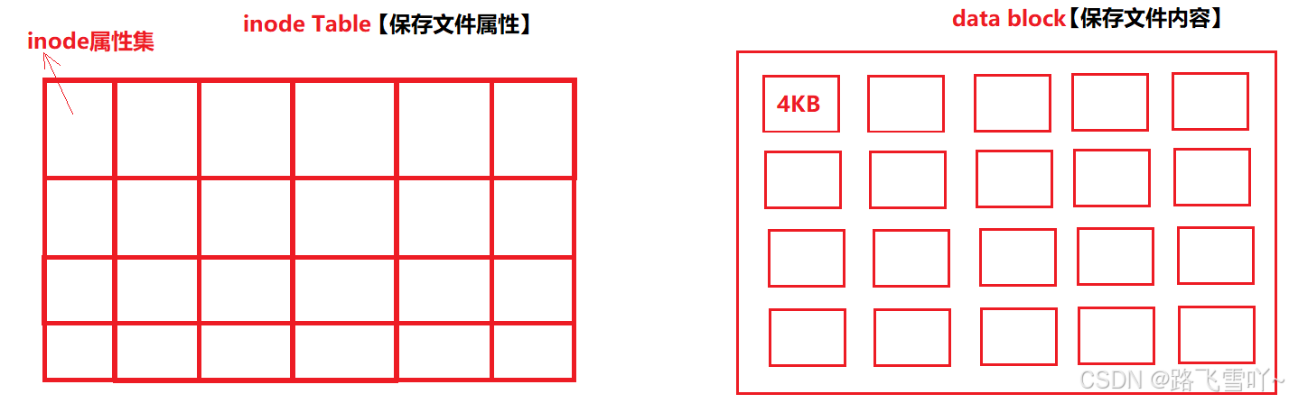 • data block 用来存放文件的内容,里面全是划分好的4KB大小的块,