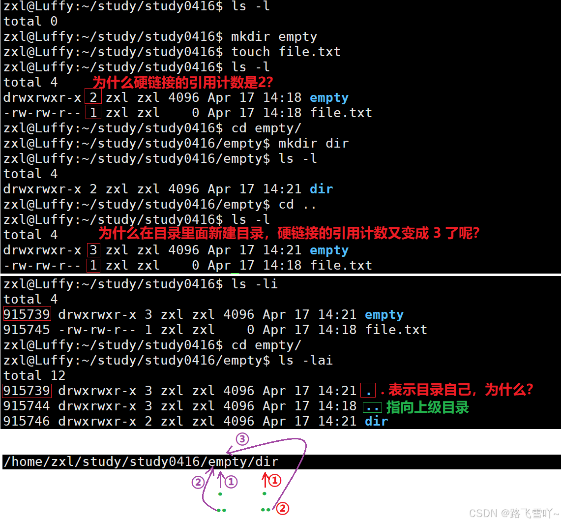 • “.” [文件名] 所映射的inode编号,和当前所处的【/empty】目录inode编号是一样的,文件名不同【. empty】但指向的inode是一样的,所以 “.” 就表示当前工作路径,所以在创建一个空目录时,一个是它自己【有一个文件名和inode有映射关系】。