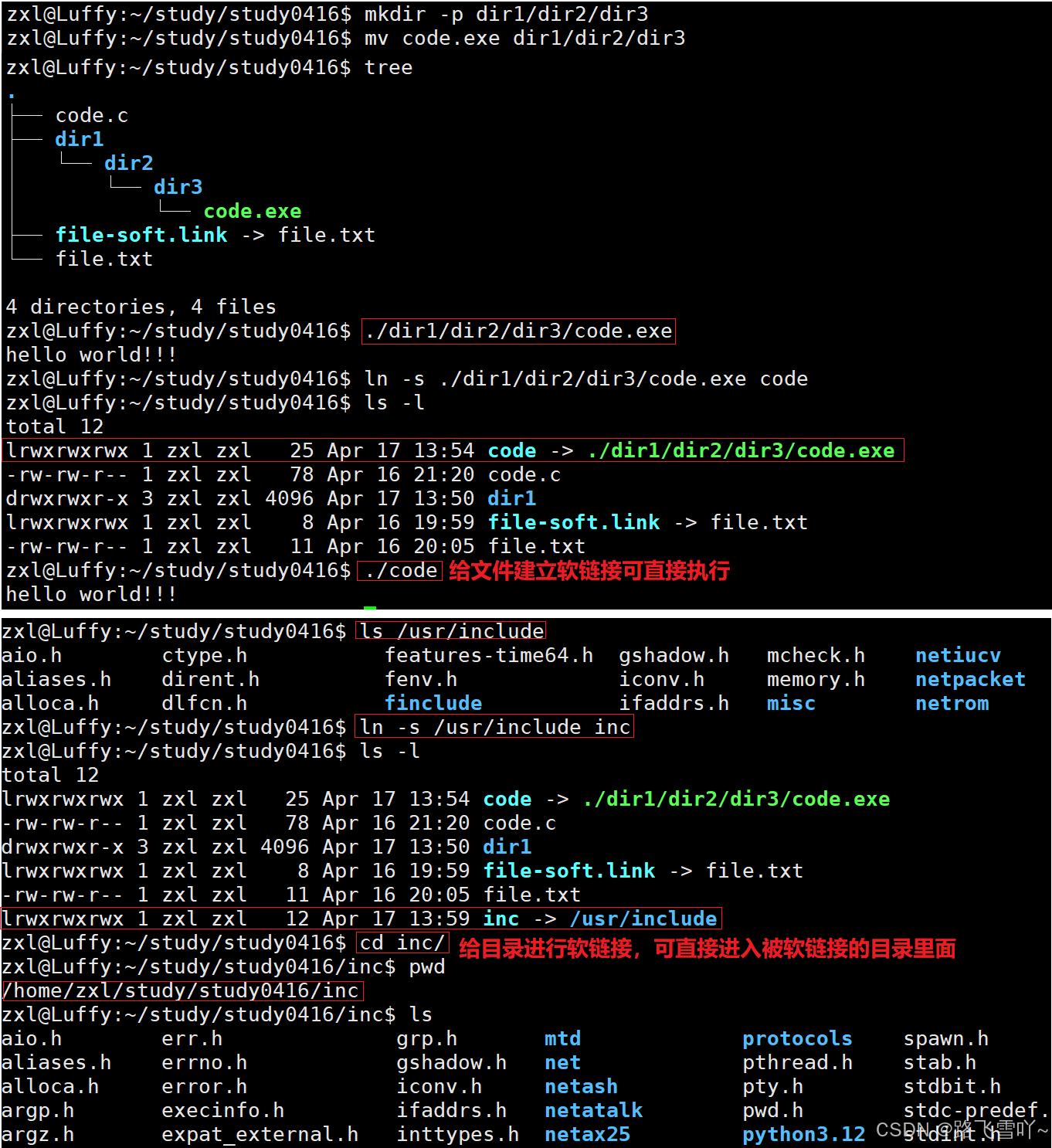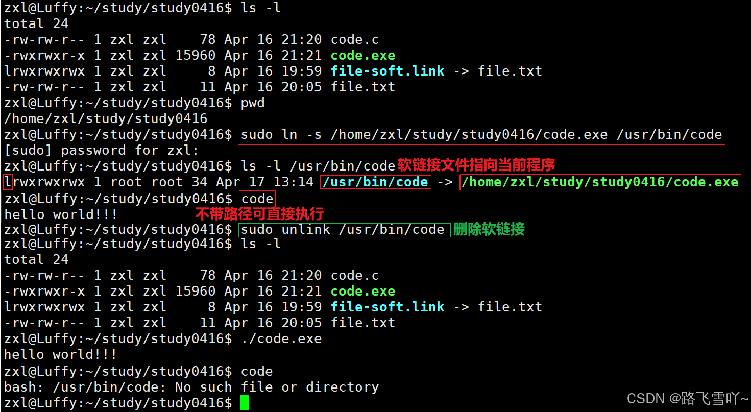 • 作用:当被执行的可执行程序放在比较深的目录下【路径很长】时,可以在深得路径下,建立软链接,也可以给目录进行软链接,直接一步进入想要进的目录里面。