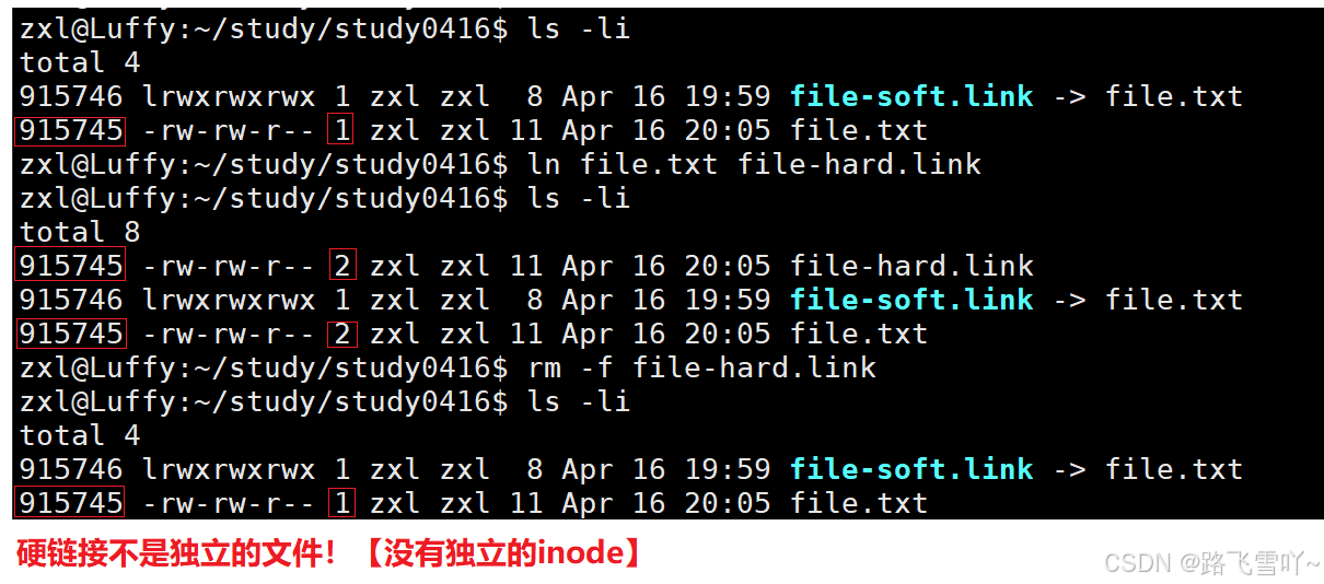 • 当我们建立一个硬链接,就是再当前目录所处的目录内部当中,新增一个新的文件名和inode对应的映射关系,所以硬链接所查到的 inode 和 目标文件的 inode 是一样的。