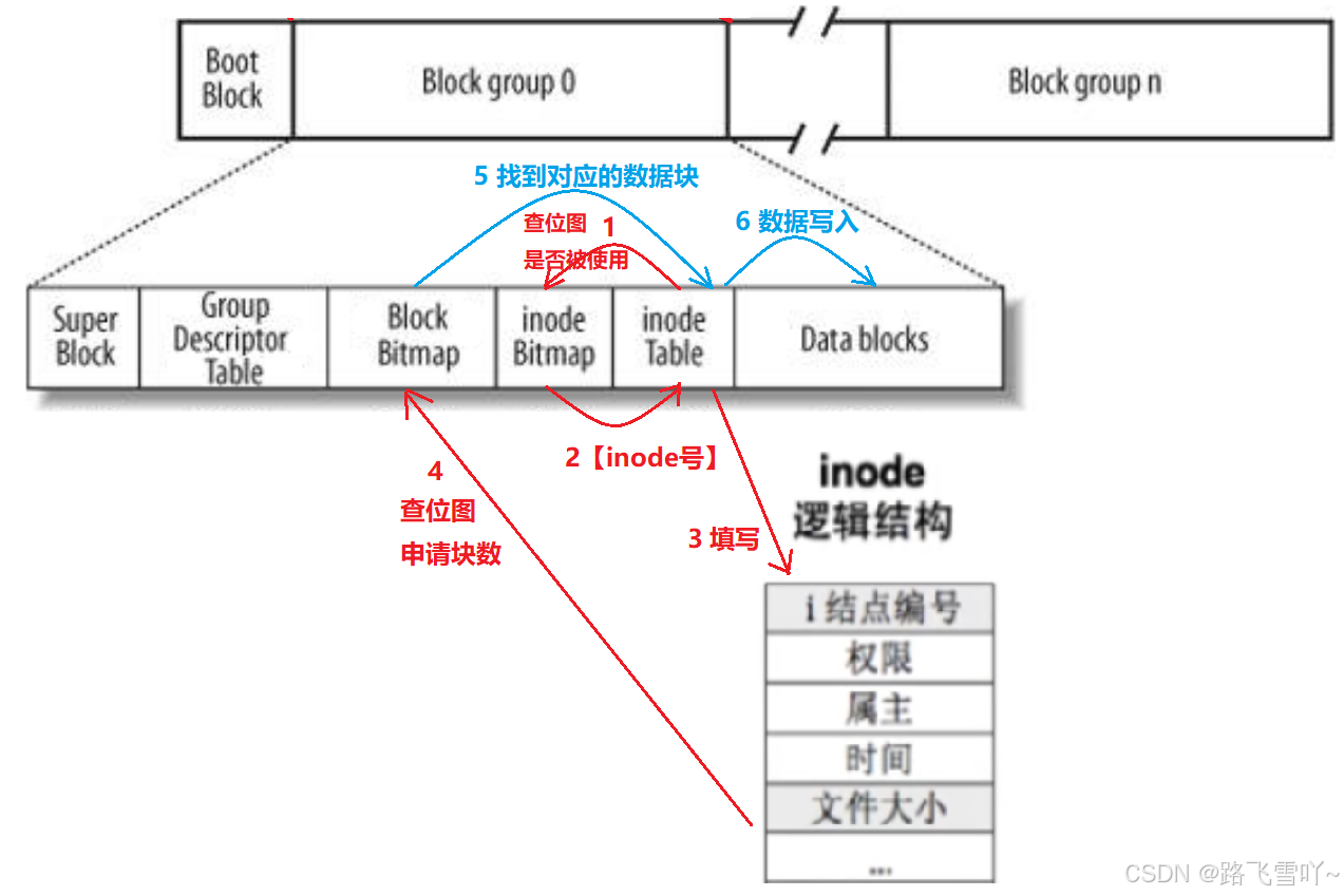 • 新建一个文件,要在inode Table里面先分配一个inode,接着在inode Bitmap里面去查某一个对应的位图有没有被使用,没有被使用就会修改对应的位图【由0-->1】,接着在inode Table里面拿着对应的inode号,初始化节点编号、填写权限、属主、时间、文件大小.....,写入之后统计需要多少个块,就回去Block Bitmap里面查位图,申请所需的块数,申请完之后,把对应的“hello world”字符串写入到对应的块号里面,接着拿着这个块号返回到inode Bitmap找到inode Table里面的数组在里面写入块号(属性), 接着在inode Table中找到对应的data blocks进行数据的写入(内容)。