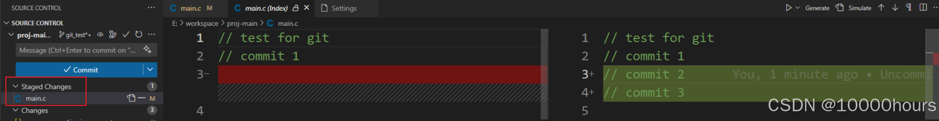 hard:reset到commit1,reset的内容被放入工作区(即commit1的内容不仅覆盖了本地仓和暂存区,还覆盖了工作区的内容)main.c的内容直接被commit1的修改覆盖。