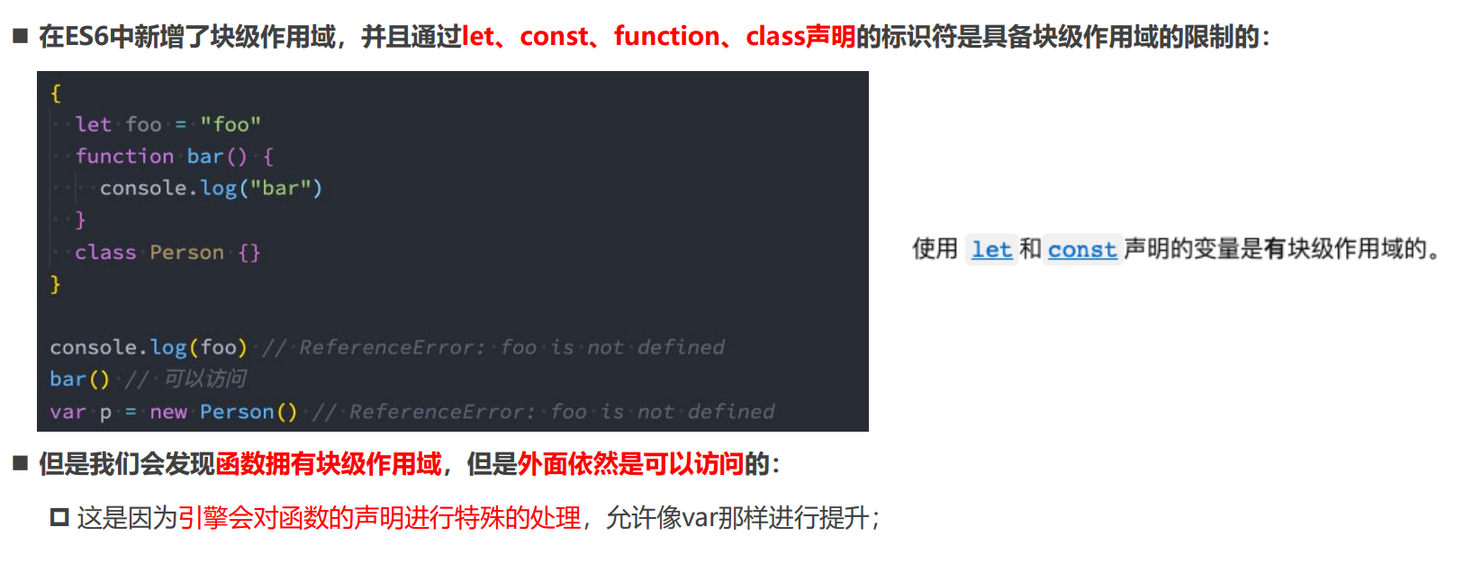 // 2.从ES6开始, 使用let/const/function/class声明的变量是有块级作用域