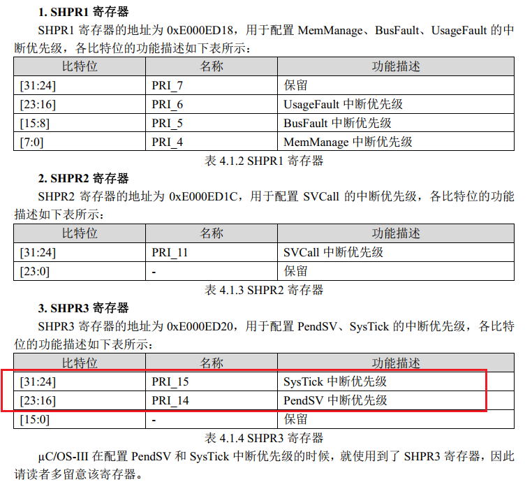 进一步的,ARM Cortex-M 还使用了抢占优先级和子优先级的机制,在 STM32 上使用 µC/OS-III 时,使用中断优先级分组 4(NVIC_PriorityGroup_4)即优先级配置寄存器的高四位全部用于抢占优先级,不使用子优先级,那么这么一来只需要设置中断的抢占优先级即可。 - 系统中断的优先级通过以下三个寄存器设置: