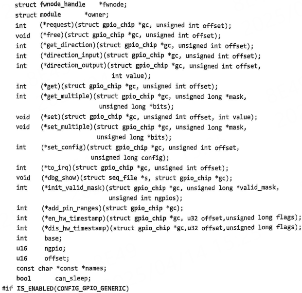 linux内核抽象出了一个结构体,叫gpio_chip,用来控制IO的电平及获取IO的电平: