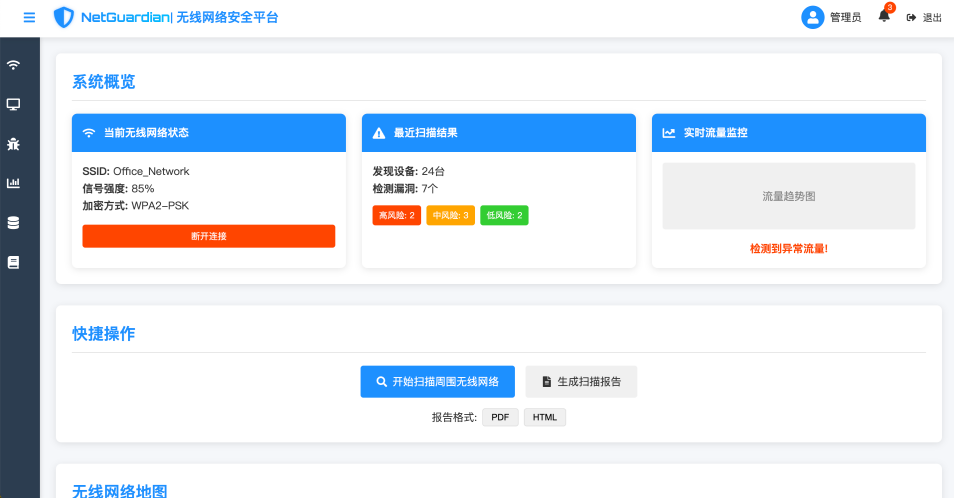 随着无线网络的普及,网络攻击风险也日益严峻。本项目旨在构建一个实时监测、智能识别、高效防护的无线网络安全平台,通过结合前后端技术与安全算法,实现对常见攻击行为的有效监控和防御。
