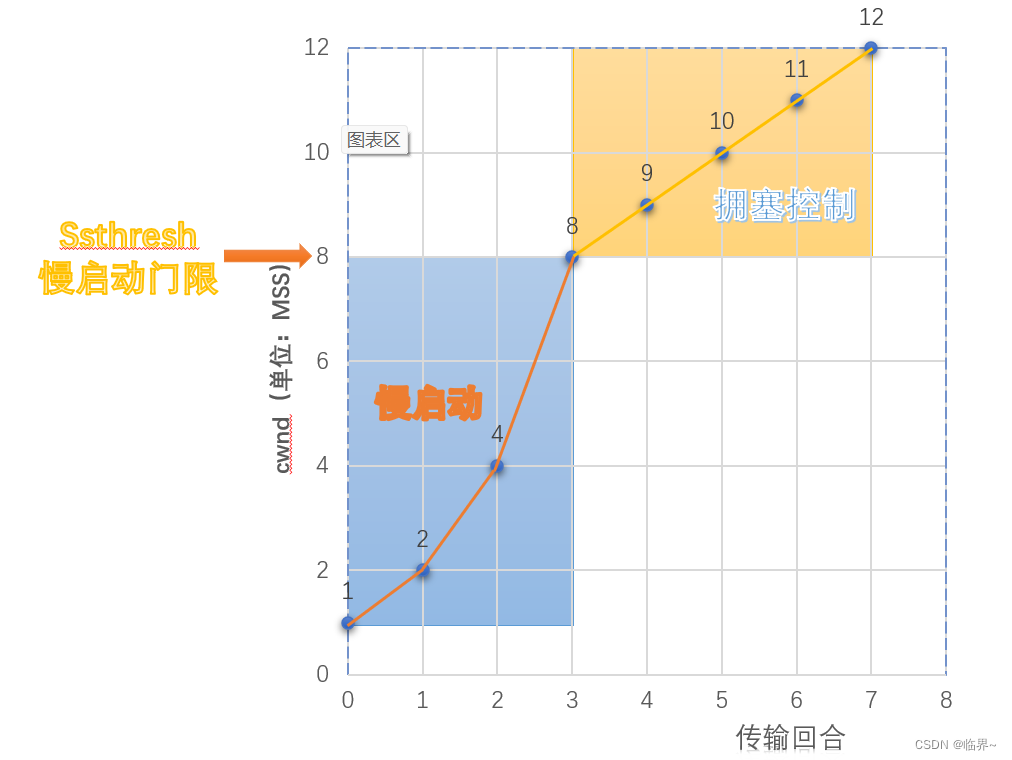 慢启动 --- slow - start,在TCP建立连接的时候的算法,最开始的时候设置为1MSS,每收到一个正常ACK(不包含重传ACK),cwnd就会增加一个MSS大小