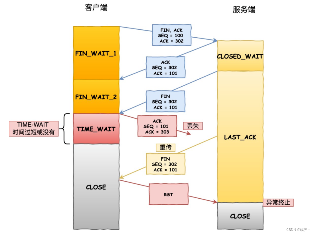 如果,这个ACK报文段一直丢失,则客户端重传FIN达到最大次数后,也将进入CLOSE(关闭)状态。