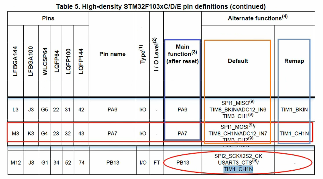 PA7引脚能被当作定时器CH1N的功能,PB13也能当作定时器CH1N的引脚说明同样的外设功能可以用在多个引脚