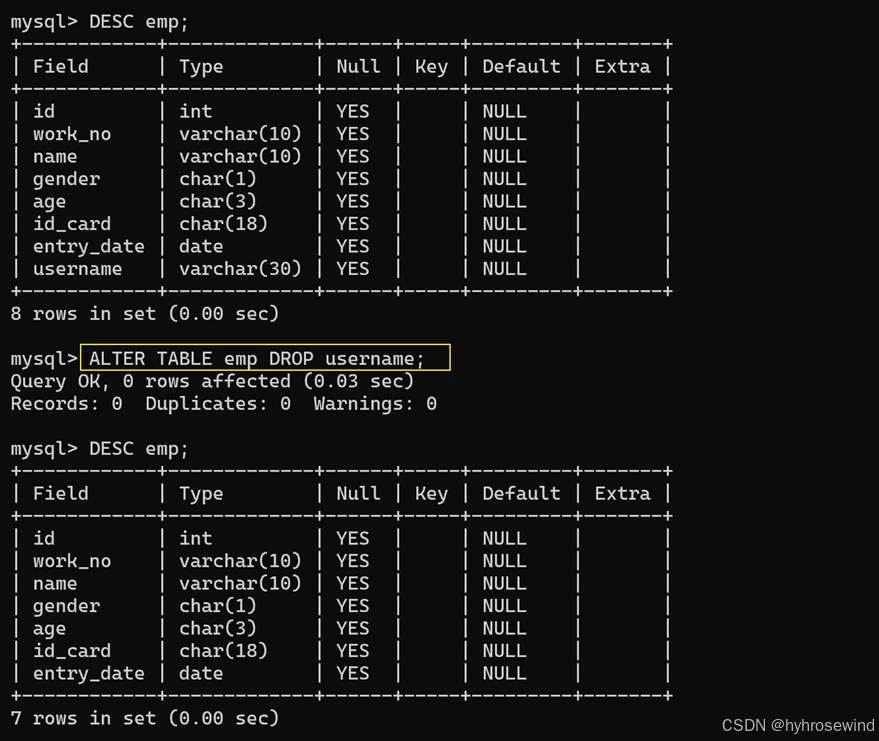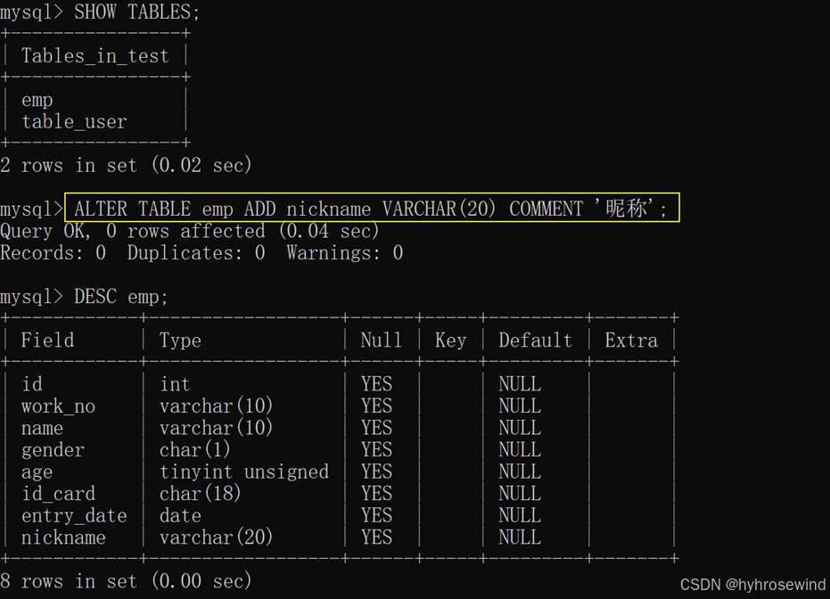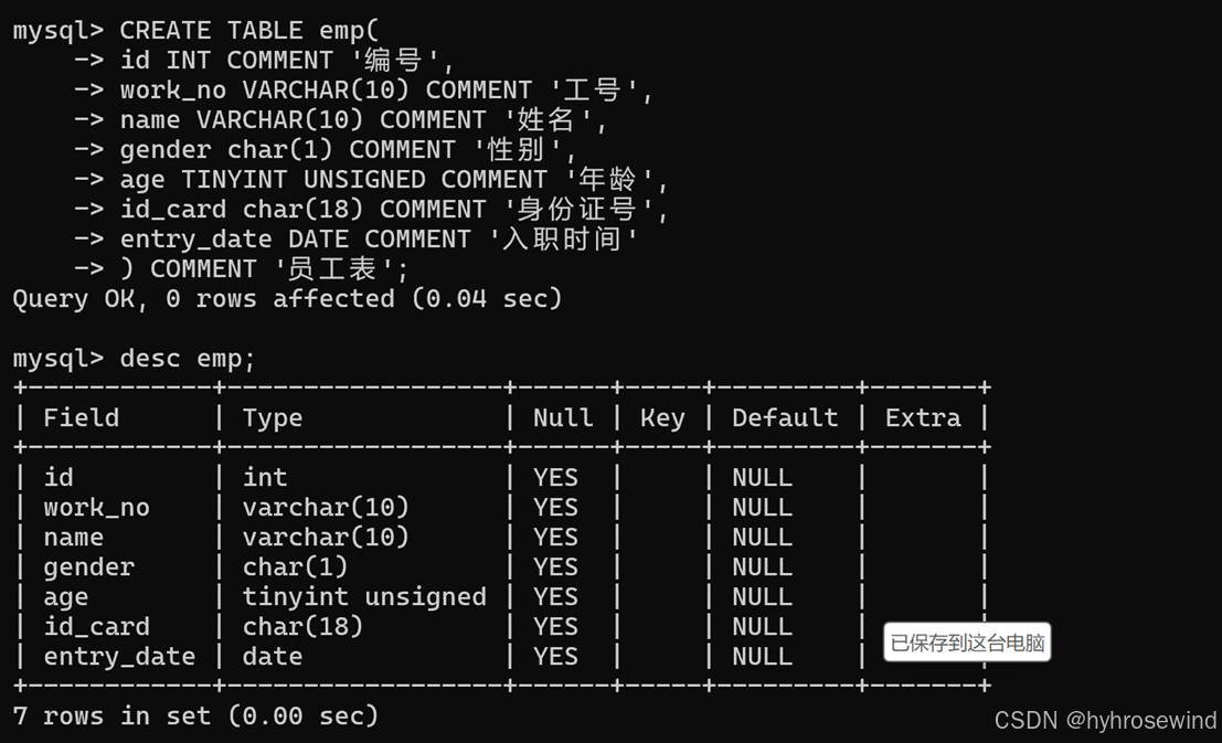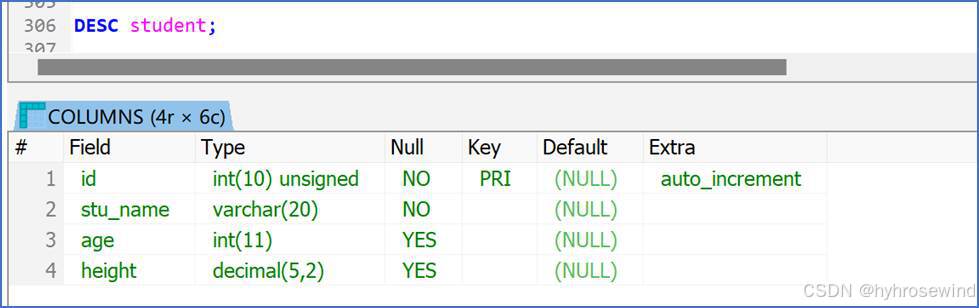 查询表结构(查看该表中有哪些字段,字段的类型等..)-示例如下: