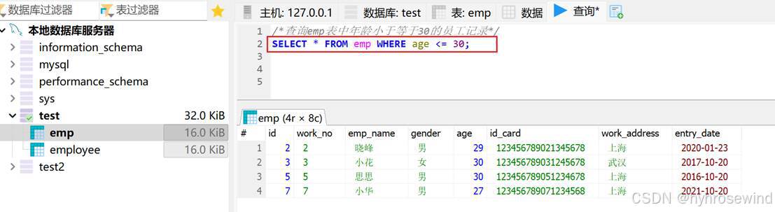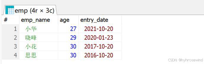 -- 查询emp表中年龄小于等于30岁的员工的姓名,年龄,入职时间,