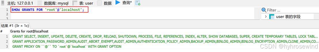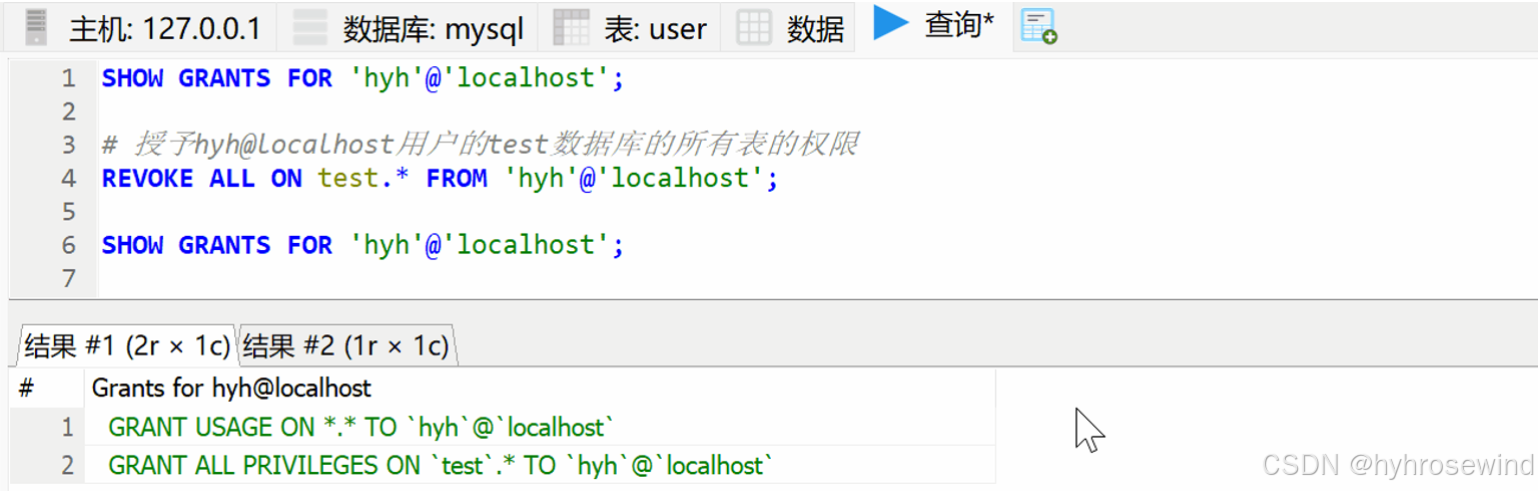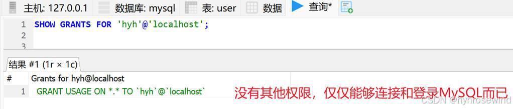 查询hyh@localhost用户的权限