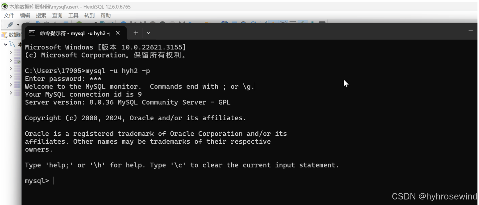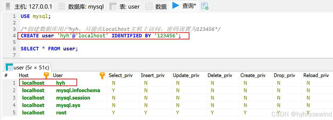 创建数据库用户hyh,只能在localhost主机上访问,密码设置为123456