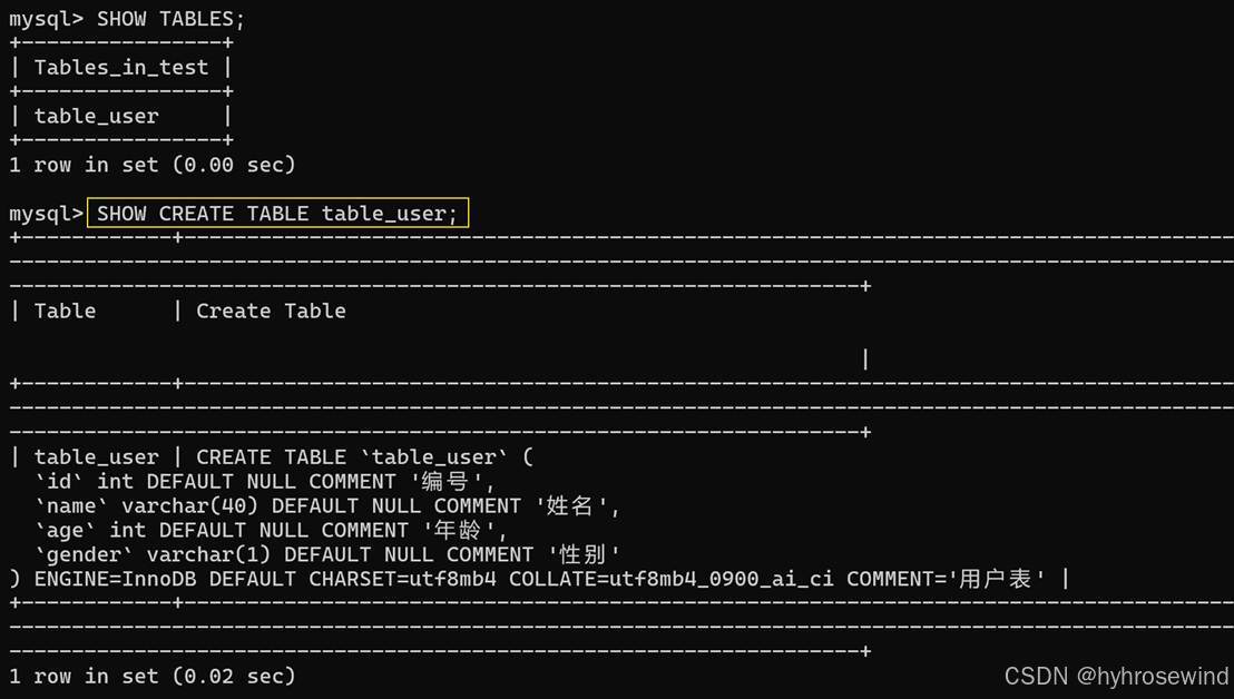 SHOW CREATE TABLE 表名;