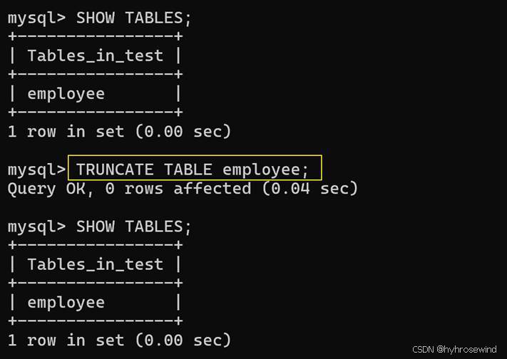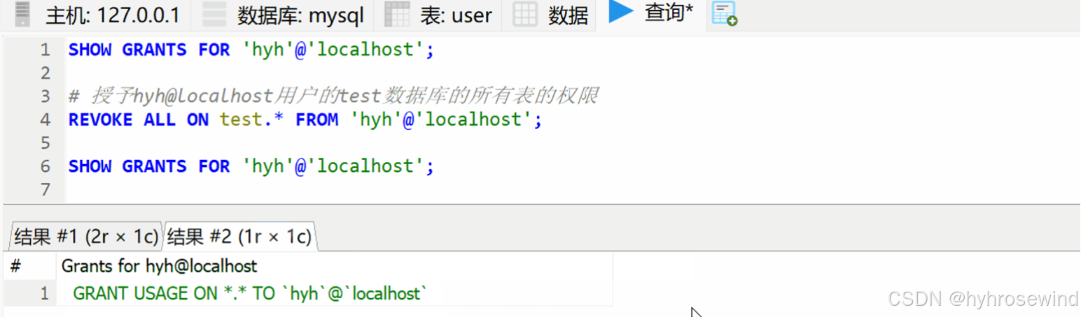 撤销hyh@localhost用户的test数据库的所有表的所有权限