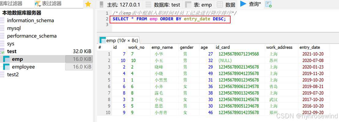 /*在emp表中,根据年龄对员工进行升序排序,如果年龄相同,再按照入职时间进行降序排序,注意:ASC省略了*/