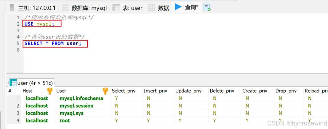 使用系统数据库mysql,查询user表中用户的信息
