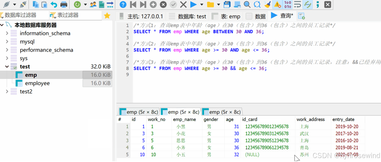 /*方式1:查询emp表中性别为男,年龄在30~40之间(包含30和40)并且姓名为2个字的员工记录*/